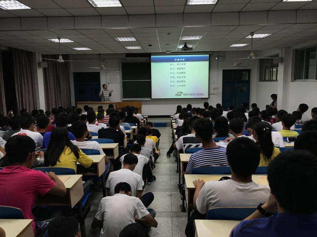 随后,谢书记又分析船舶工业的现状和发展趋势,谢书记主要从国家建设海洋强国和强大海军的战略角、国际贸易和世界航运发展两个方面告诉同学们“你们是稀缺的,你们是重要的,毕业后必将大有可为”。同时分析了2016届毕业生的就业数据,让新生们从中了解到了船海人广阔的发展前景。
